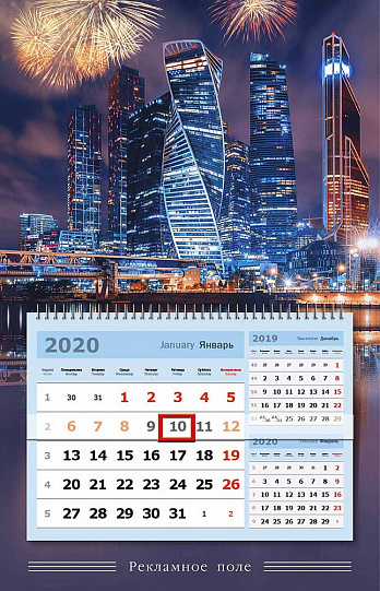 1- секционный квартальный календарь с бумажным постером (блок три в одном)