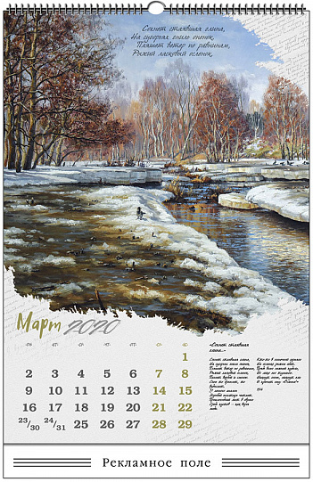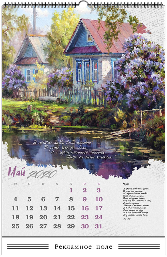 К 125-летию со дня рождения С. А. Есенина наше издательство выпускает календарную серию, созданную по мотивам его стихотворений о русской природе. Выросший на просторах Рязанщины, поэт перенял обычаи и фольклор своей родины, в них берет начало его творческая самобытность. Он передает свои чувства не только при помощи описания состояний природы. Есенинская природа имеет душу — она единый организм, целая вселенная, которая рождается и умирает, грустит и радуется, обновляется и воскресает. И если мы порой затрудняемся в поиске нужных слов, чтобы выразить глубину любви к родному краю, то обязательно обращаемся к лирике поэта. Иллюстрации для календарной серии подготовлены с использованием работ художника В. А. Артамонова, работающего в жанре реалистического пейзажа и воспевающего тихую красоту среднерусской природы Нижегородского края.