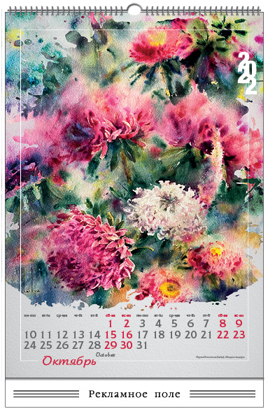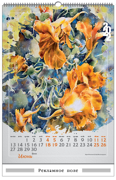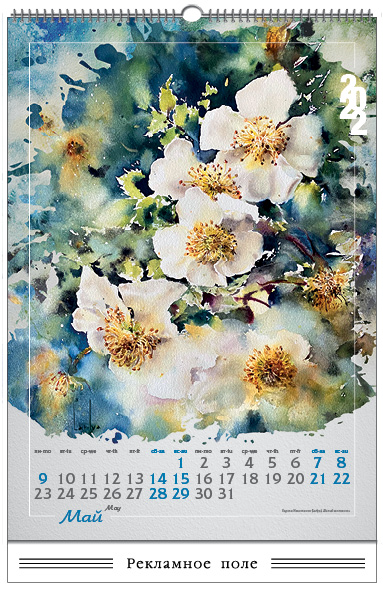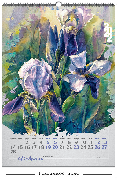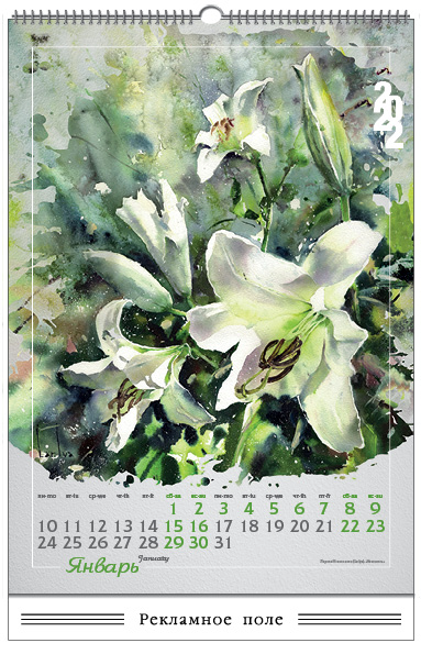 Из всех художественных техник акварель, сочетающая в себе особенности живописи и графики, больше всего подходит для изображения цветов. Письмо по-сырому передает изящество и прихотливость их силуэта, отражающая свет основа, белая бумага, — нюансы и переливы оттенков, воздушность пыльцы, прозрачность лепестков, быстрое нанесение краски воспроизводит чуть заметное движение цветка от дуновения ветра. В этой технике работает художник Лариса Иванисенко (LarIva) — член Международного Акварельного Сообщества IWS Global Membership (International Watercolor Society), член Японского Международного Института Акварели. Работы автора хранятся в частных коллекциях в Германии, Англии, Франции, Южной Корее, Чехии, Америки. Познакомиться с некоторыми из них вы можете на страницах нашего календаря «Прекрасные цветы».