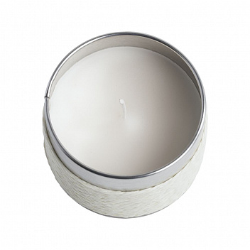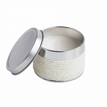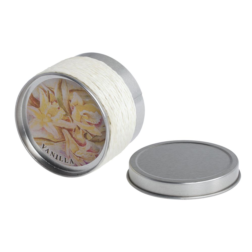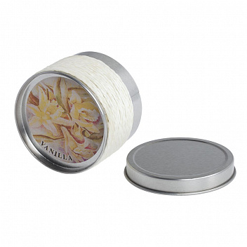 Cвеча c ароматом ванили в декоративной жестяной коробке.
