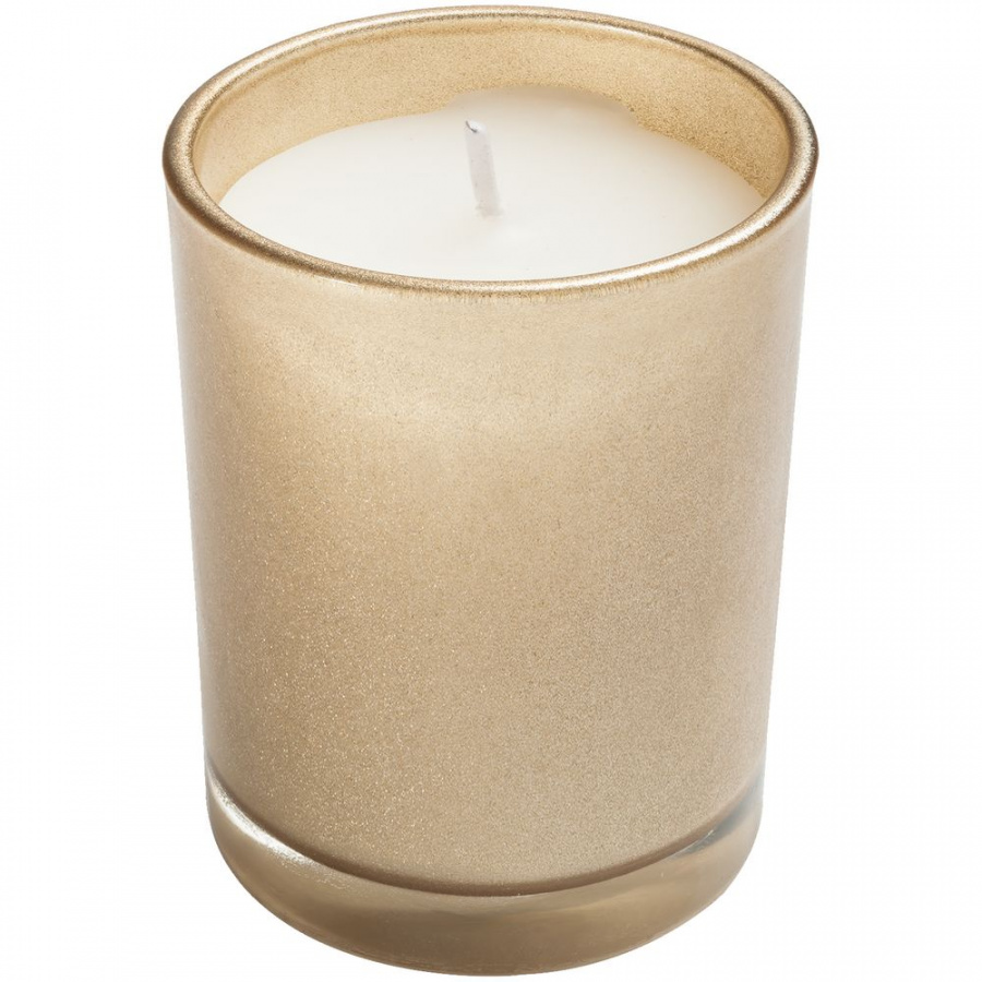 Свеча с легким парфюмерным ароматом в стеклянном подсвечнике.