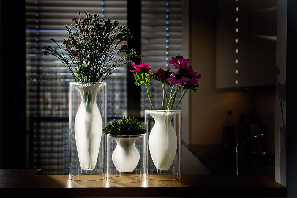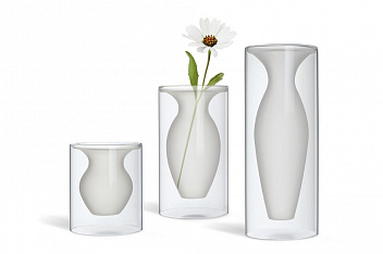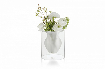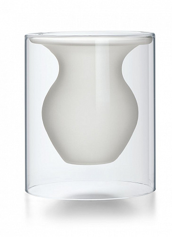 Ваза выглядит так, будто парит в воздухе, и этот необыкновенный эффект усиливается контрастом прозрачного стекла стенок корпуса и матового стекла самой вазы. В вазе замечательно смотрятся букеты из нежных цветов, но и сама по себе она — прекрасное украшение интерьера.